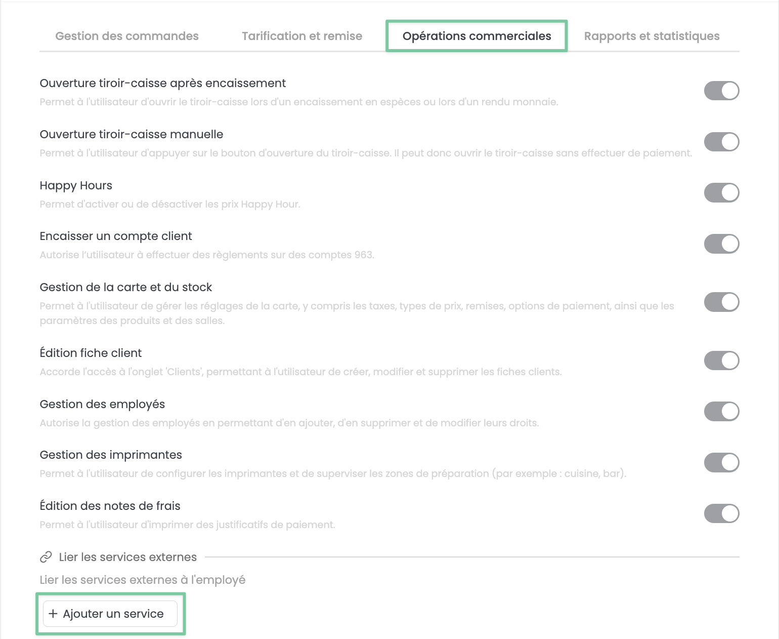 3. Dans l’onglet Opérations commerciales, descendez jusqu’à la section Lier les services externes.
