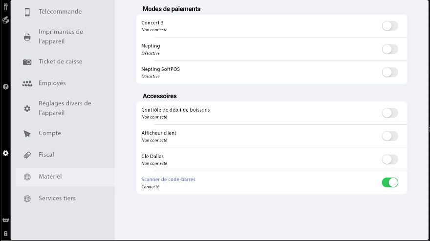 Allez dans l'onglet Réglages > Matériel puis Appuyez sur Scanner de code-barres.