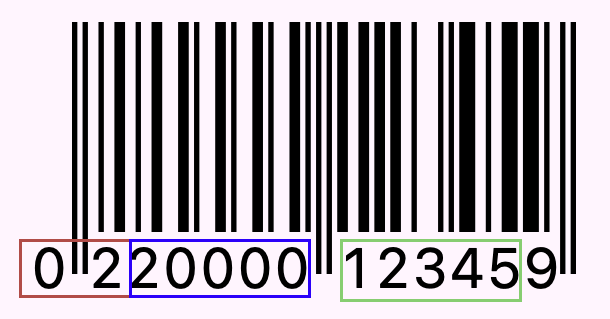 - En Bleue : Les 5 chiffres suivants représentent soit le poids du produit en grammes (si le préfixe est impair), soit son prix en centimes (si le préfixe est pair).