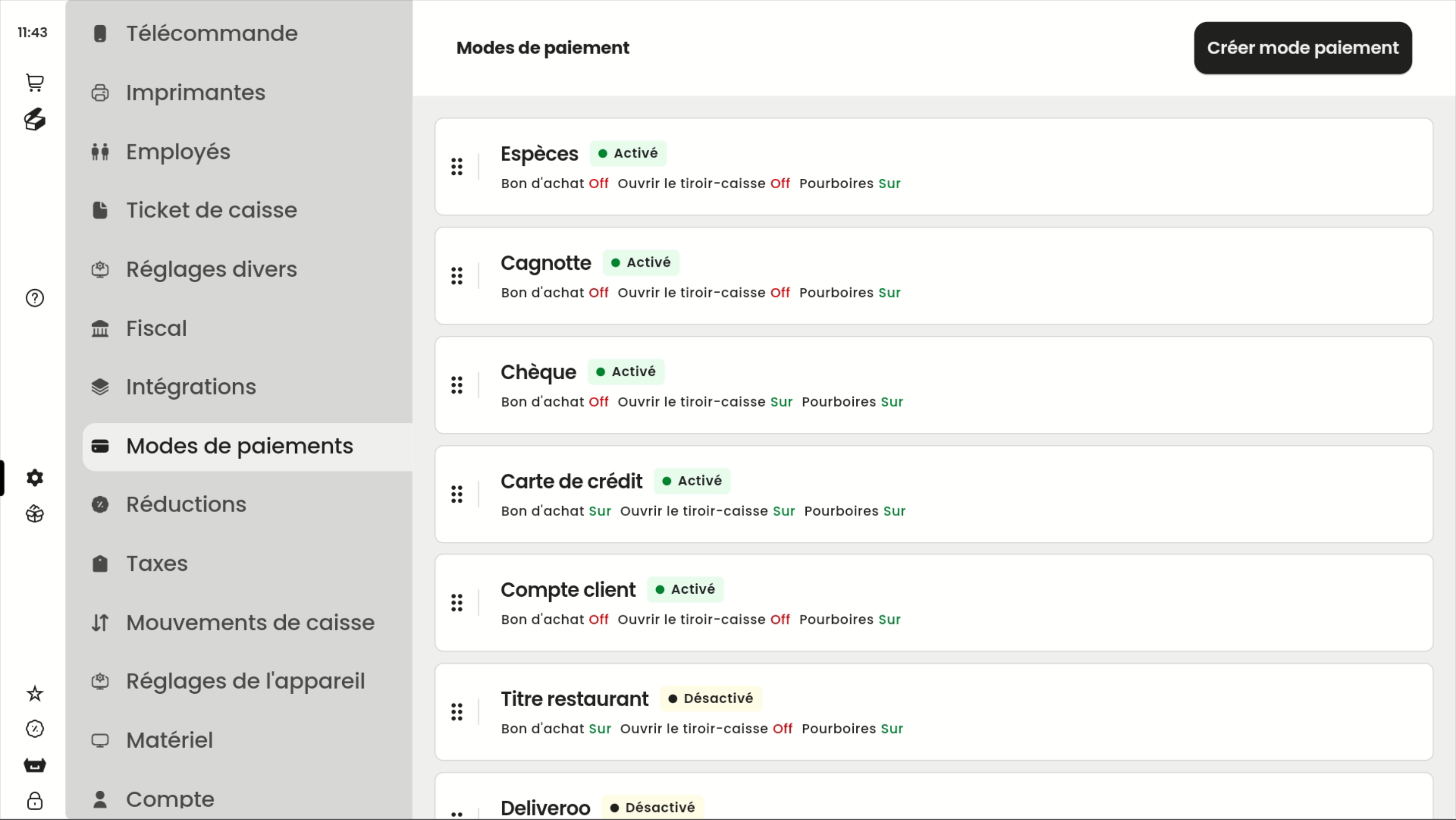 Vous pouvez créer, consulter et modifier vos modes de paiement en appuyant sur Réglages puis Modes de paiement.