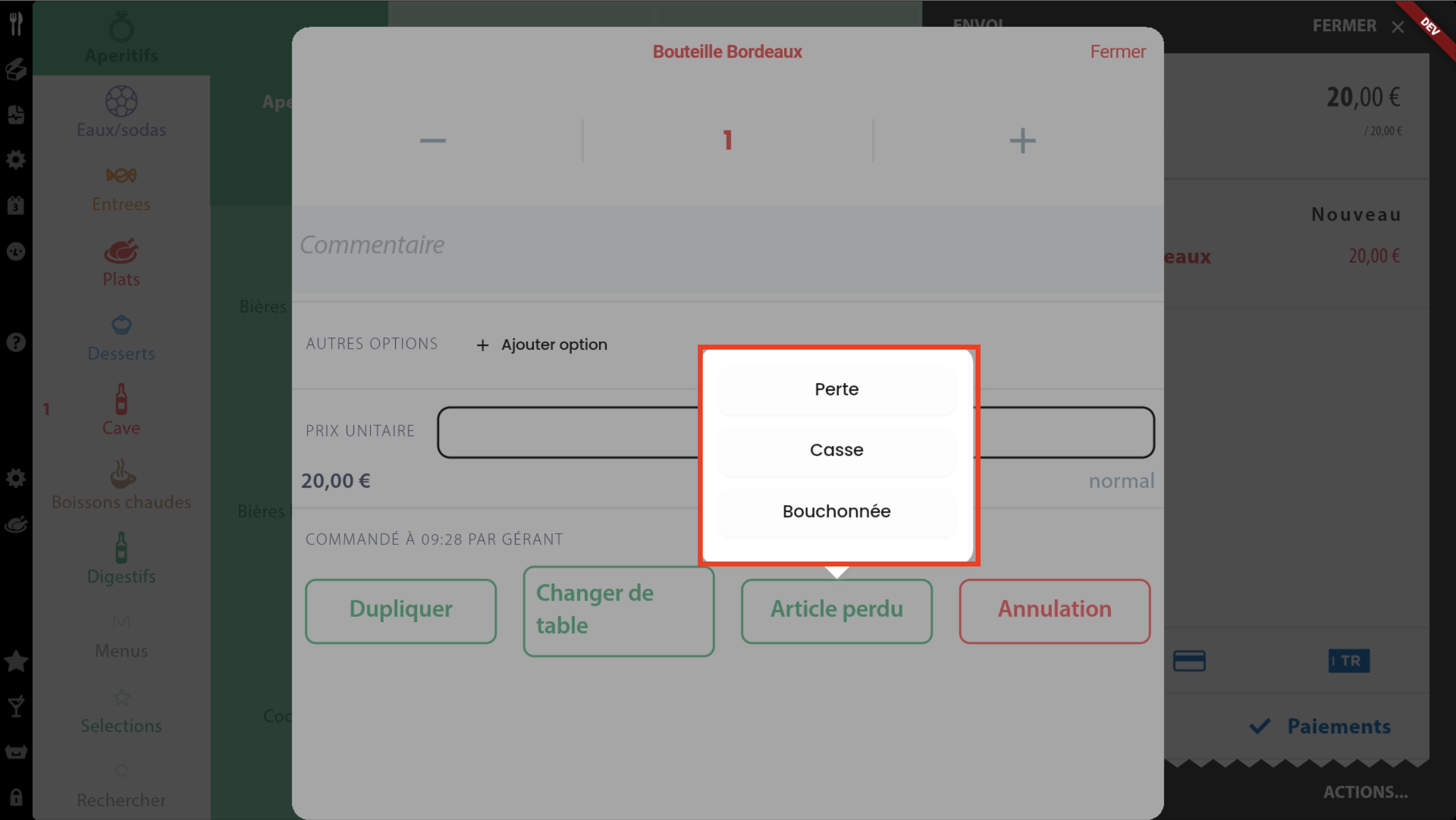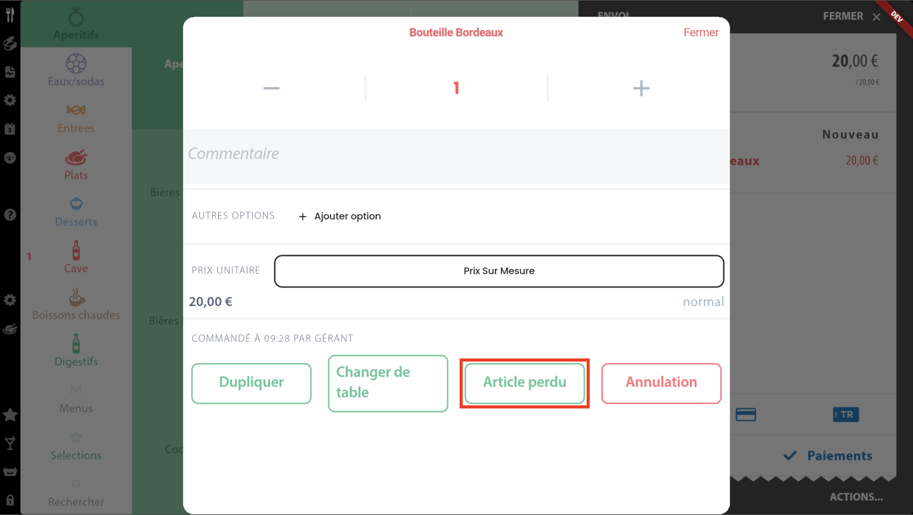 Si la perte est déclarée après l’envoi en cuisine, un article sera automatiquement ajouté à la commande avec les mêmes remises et options que l’article perdu, ce qui entraînera le décompte d’une quantité supplémentaire dans le stock.