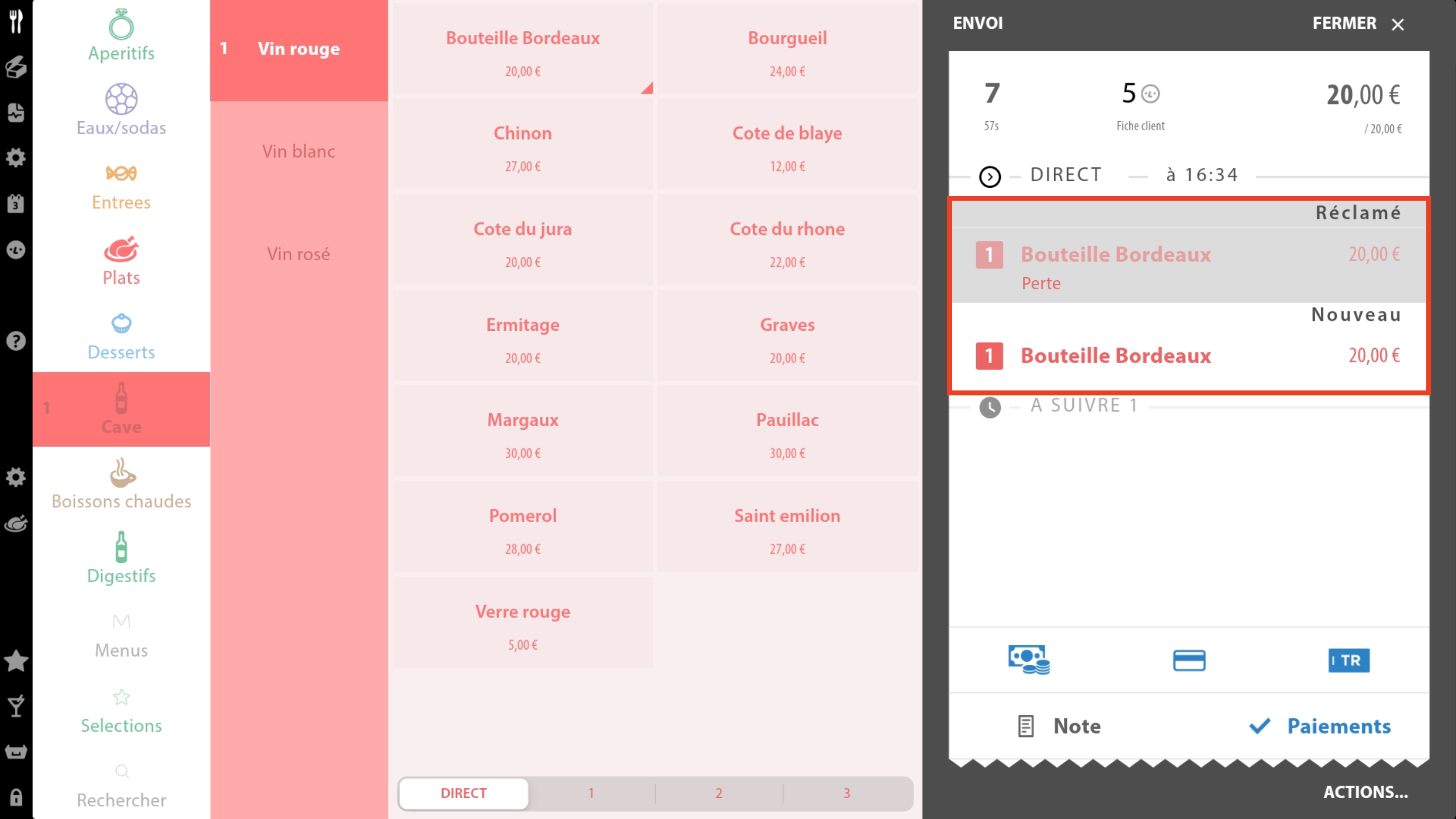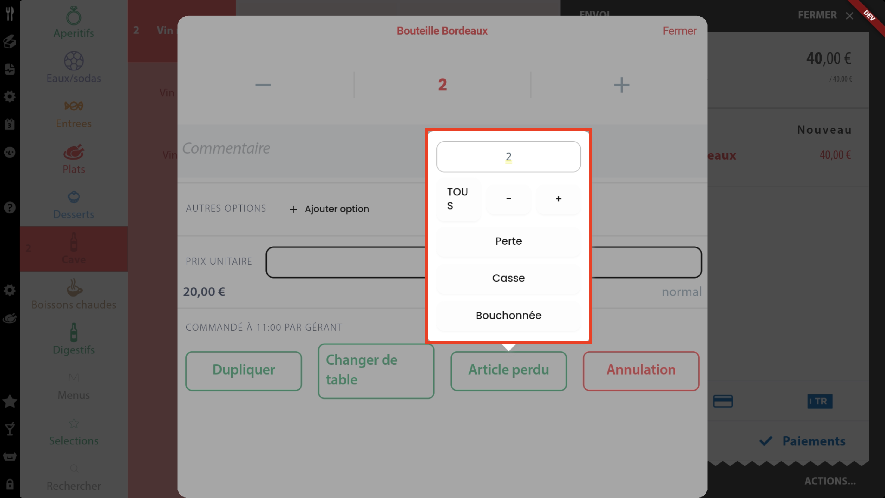 Si un article est saisi sur la mauvaise table, il est possible de le transférer sur une autre table. Sélectionnez l’article en question puis appuyez sur le bouton Changer de table. Il vous sera demandé de saisir le numéro de la table de destination.