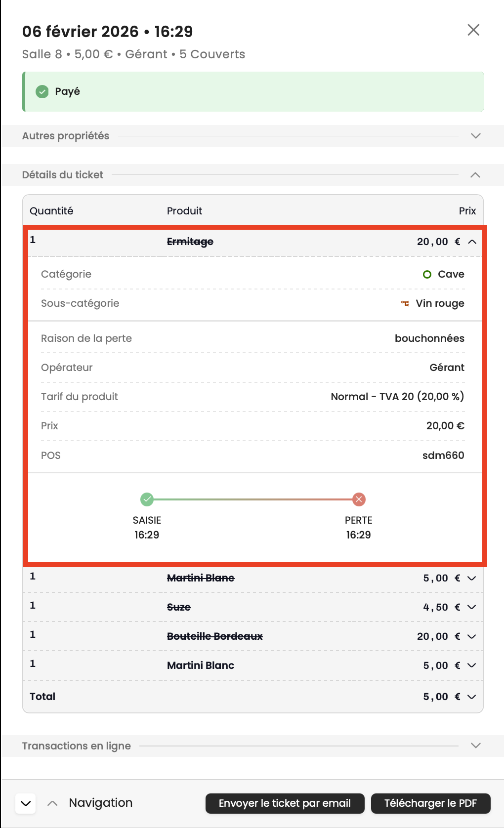Les articles déclarés en perte ne s’afficheront pas dans la commande lors de l’encaissement.