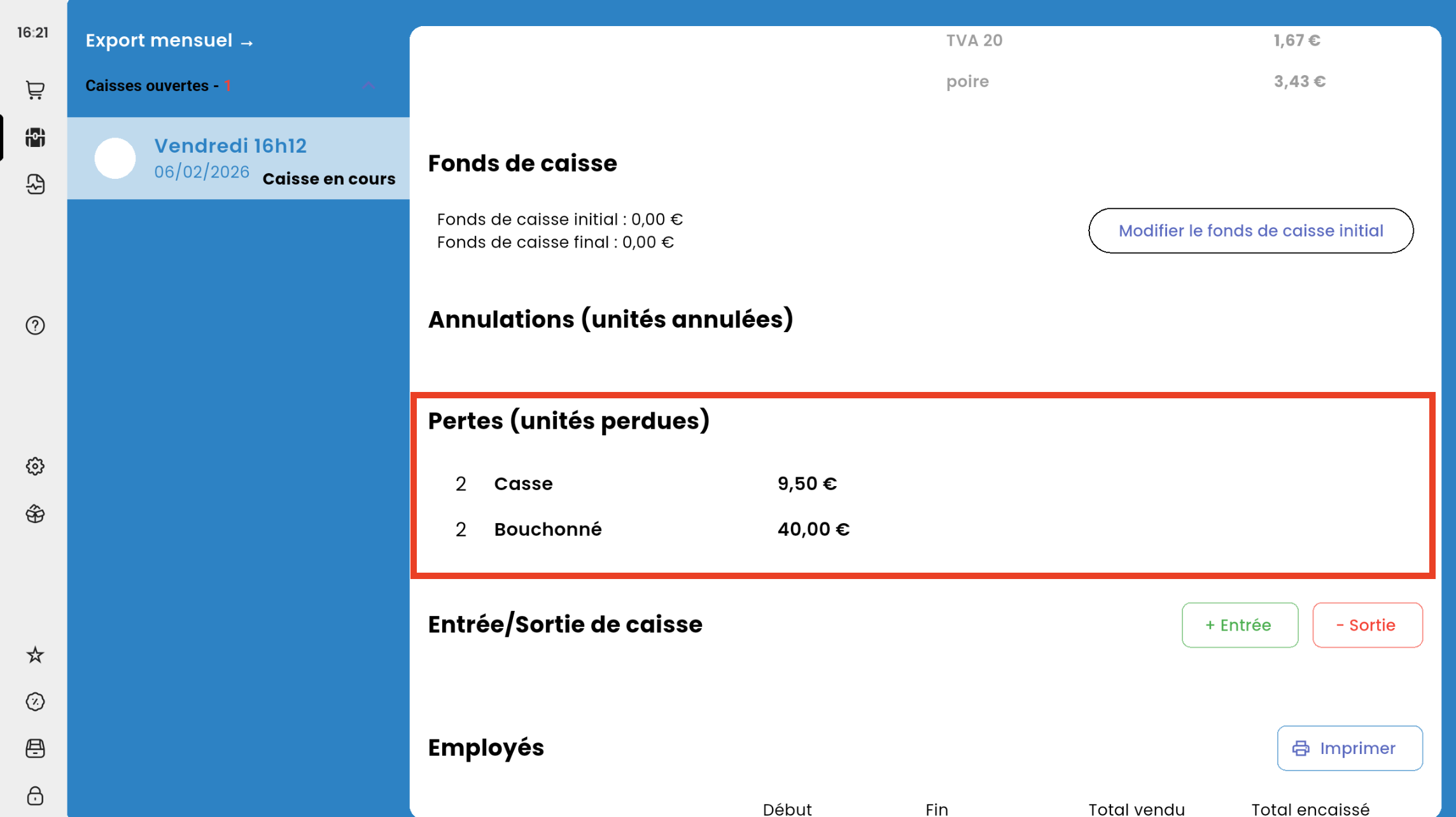 Pour consulter vos pertes, elles seront présentes dans votre rapport de caisse, sur le X de caisse et également sur le Back Office.